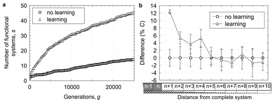 The effect of plasticity on the evolution of complex biological structures and behaviours is even more dramatic if the number of generations needed to evolve the same number of functional systems is considered. For the same settings as used in Figure 2a, it took 2458 generations for the plastic populations to accumulate 14.3 systems. This is more than 10 times faster than in the populations that evolved without plasticity.