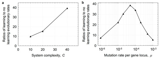 Effects of plasticity on the rates of the evolution of system complexity and mutation. The acquisition rate in the populations that exhibited plasticity relative to those that did not is shown in (a) for different values of the parameter C that specifies the number of elements required to generate the functional system and provides a measure of the system’s complexity and in (b) for different rates of mutation µ. The ratios were obtained from the mean of 10 simulations and averaged over the range of mutation rates ( [10−6, 10−3]) in (a) and over the system’s complexities (C = {10;20;40}) in (b).