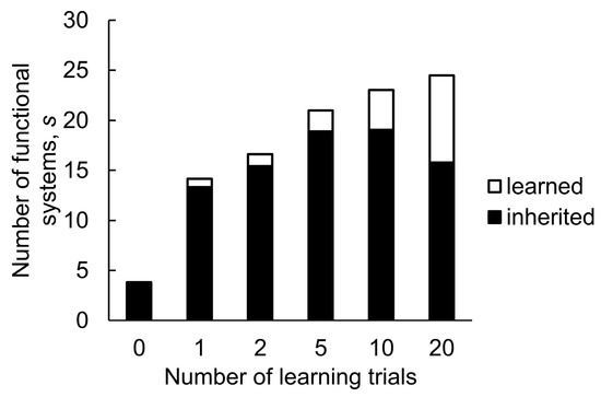 The standard explanation given for the evolution of complex phenotypic traits, including adaptive behaviour, is that it involves the gradual accumulation of the necessary component processes by reorganisation of the genome alone [39,40]. The problem is that, in most cases, even the evolution of the simplest adaptive trait requires a number of independent reorganisations of the genome, including multiple gene mutations, changes in gene regulation, chromosomal rearrangements, and alterations in genetic networks that collectively contribute to the development and expression of the new trait. Evolutionary and developmental interactions between genotype and phenotype lead to highly nonlinear dynamics of evolvability [41,42,43,44,45,46,47,48,49,50]. When the adaptation depended on the simultaneous occurrence of a combination of such reorganisations that would be useless on their own, inevitably the evolutionary process would have been slow. Moreover, the time to acquire the adaptation by mutation grows nonlinearly with the required number of genomic reorganisations. Suppose that every reorganisation is expected to appear in a population every 10 generations; then, the addition of one more reorganisation to the combination will delay the appearance of the adaptation 10-fold. Another complication arises from the fact that, due to pleiotropy, a single mutation can affect multiple phenotypic traits. Yet, a growing body of evidence suggests that complex behaviour has evolved rapidly in birds and mammals [51,52,53,54]. In this paper, we show how such integrated systems could appear rapidly in the course of evolution under the guidance of an individual’s plasticity and the use of elements shared by different functional systems. Many different forms of plasticity have been recognized, including the various forms of learning operating at the behavioural level, while other forms of plasticity operate at lower levels of organisation [3]. In this study, we consider plasticity as the functional capacity of an individual to adapt its phenotype for environmental challenges through non-heritable modifications.