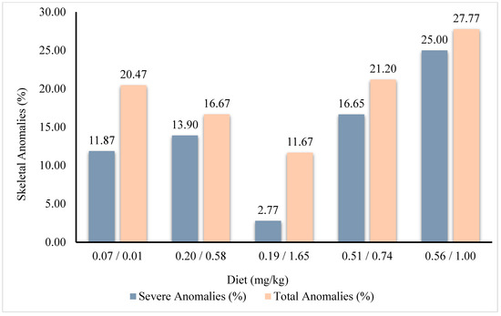 | Skeletal Anomaly Frequency (%) | (0.07/0.01) | (0.20/0.58) | (0.19/1.65) | (0.51/0.74) | (0.56/1.00) | Kruskal-Wallis Test |