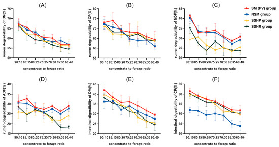Rumen degradability and intestinal digestibility of mutton sheep diets with different concentrate-to-forage ratios. Rumen degradability of DM (A), CP (B), NDF (C), ADF (D); intestinal digestibility of DM (E), CP (F). SM (PV) group: soybean meal group (peanut vine group), raw materials: corn grain, soybean meal, DDGS, wheat bran, peanut vine, sodium bicarbonate, premix. NSM group: no soybean meal group, raw materials: corn grain, cottonseed meal, rapeseed meal, DDGS, wheat bran, peanut vine, sodium bicarbonate, premix. SSHP group: sunflower seed hull and peanut vine group, raw materials: corn grain, soybean meal, DDGS, wheat bran, sunflower seed hulls, peanut vine, sodium bicarbonate, premix. SSHR group: sunflower seed hulls and rice hulls, raw materials: corn grain, soybean meal, DDGS, wheat bran, sunflower seed hulls, rice hulls, sodium bicarbonate, premix.