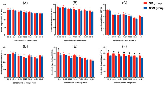 Rumen degradability values of DM, CP, NDF, and ADF in the SM group and NSM group were not significantly different in relation to the concentrate-to-forage ratio (p > 0.05) (Figure 3A–D). When the concentrate-to-forage ratio was 90:10, the intestinal digestibility of DM in the SM group was significantly higher than that in the NSM group (p < 0.05), and there was no significant difference between the intestinal digestibility of DM in the SM group and NSM group under other concentrate-to-forage ratios (p > 0.05) (Figure 3E). The CP intestinal digestibility of the SM group was significantly higher than that in the NSM group at seven concentrate-to-forage ratios (p < 0.05) (Figure 3F).