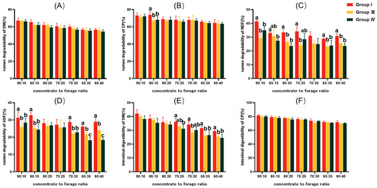 The intestinal digestibility of the DM and CP of the four experimental diets decreased with the decrease in the concentrate-to-forage ratio (Figure 1E,F). The intestinal digestibility values of DM and CP were higher when the concentrate-to-forage ratios were 75:25~90:10. There were no differences in intestinal digestibility between DM and CP in the ratios of 75:25 and 80:20 (Figure 1E,F).