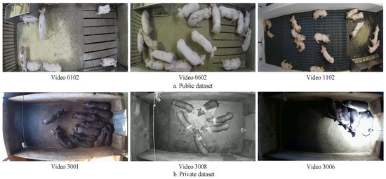 The study utilizes two distinct datasets. The first dataset, provided by Posta et al. [26], is a publicly available dataset comprising 19 one-minute video clips and 4 ten-minute video clips. The videos cover a variety of complex environments, including different pig quantities, different pig ages, and lighting conditions. For training, 6 one-minute video clips are randomly selected, while the remaining clips are used for testing. The second dataset is a private dataset captured from a commercial pig farming facility in Foshan City. It consists of 19 one-minute video clips and 1 one-hour video clip, with 10 used for training and 10 used for testing. The resolution of these videos is 2688 × 1520, and each video is captured and annotated at a rate of 5 frames per second (fps).