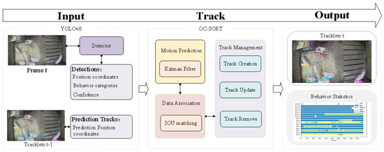 This study introduces the V8-Sort for the target tracking and behavior analysis of group-housed pigs. The overall structure is illustrated in Figure 2. First, YOLOv8 is employed as the detector to complete four tasks including target detection, displaying the target’s bounding box positions, behavior categories, and confidence scores. Secondly, the OC-SORT algorithm is utilized to track each pig to reduce the impact of pigs’ adhesion and occlusion on tracking. It contains three key tasks: motion prediction, data association, and track management. Finally, we create the behavior analysis method to calculate the frequency of each behavior for each pig based on the pig’s ID and categories information. Therefore, the behavioral statistics information for all pigs is yield.
