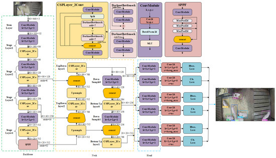The YOLOv8n algorithm is employed as the target detector for object detection, and its model structure is primarily divided into three components: (i) Backbone for extracting image features; (ii) Neck for fusing multi-scale feature information; (iii) Prediction for predicting confidence, category, and anchor boxes. The pipeline of the YOLOv8n is shown in Figure 3. The backbone of YOLOv8n consists of 10 layers and is organized into 5 sections, namely Stem layer, Stage layer1, Stage layer2, Stage layer3, and Stage layer4. The Neck part consists of 7 layers, which are divided into 6 parts, including TopDown layer1, TopDown layer2, Down Sample0, Bottom Up layer0, Down Sample1, and Bottom Up layer1. The Head part is composed of 6 layers and divided into 3 parts, each of which consists of ConvModule, Con2d, Bbox.Loss, and Cls.Loss. The functional descriptions of each layer can be found in Table 2. YOLOv8n is trained with specific parameters, including 80 epochs, an intersection over union (IOU) threshold of 0.7, and a default confidence threshold of 0.25. Compared to older versions of the YOLO algorithm, YOLOv8n maintains high speed and accuracy while also offering greater versatility, flexibility, and simplicity.