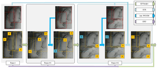 When a target is lost for re-tracking, OC-SORT can employ the OCR, OCM, and ORU strategy to recover the lost trajectory through virtual trajectories. Figure 5 illustrates the process of pig re-tracking using OC-SORT. The red boxes are detections, yellow boxes are active tracks, blue boxes are untracked tracks, and dashed boxes are the estimates from KF. During association, OCM is used to add the velocity consistency cost. Target #1 is lost on the frame t + 1 because of occlusions. But, on the next frame, it is recovered by referring to its observation of the frame t by OCR. It being re-tracked triggers ORU from t to t + 2 for the parameters of its KF. Through the OCR, OCM, and ORU modules in OC-SORT, the robustness during pig occlusion and nonlinear motion has been enhanced.