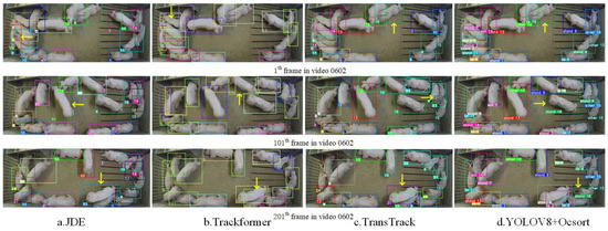 Figure 6 illustrates the comparison of V8-Sort with other MOT methods on public datasets. In Figure 6, the yellow arrows indicate the maximum ID for each frame. It can be observed that JDE (a), Trackformer (b), and TransTrack (c) have the highest tracking IDs values of 93, 419, and 31 in frame 201 of video 0602. These numbers of IDs differ from the actual number of pigs in the pigsty (16), leading to frequent pig ID errors. In contrast, V8-Sort (d) consistently maintained the maximum number of IDs of 16 without any erroneous ID changes.