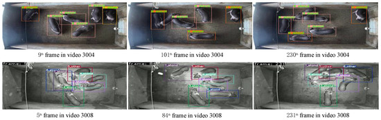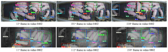 To validate the feasibility and reliability of V8-Sort, we selected several segments from validation videos that were not used for training. From each of these segments, we chose three frames for presentation, and the tracking results are shown in Figure 8 and Figure 9, which, respectively, depict the visualization of tracking results for V8-Sort on public and private datasets. In the video segments 0402, 0802, 3004, and 3008, the maximum numbers of IDs of pigs in each frame are maintained at 15, 13, 6, and 6, respectively, which match the actual numbers of pigs. In conclusion, the aforementioned tracking results comprehensively demonstrate the outstanding accuracy and stability of the method proposed in this study within the complex environment of pig activity areas. By visualizing the tracking results, we can intuitively observe changes in pig behavior and trajectory evolution, enabling a deeper understanding of pig behavioral patterns and activity habits. This can provide valuable technological support for precision farming management of pigs.