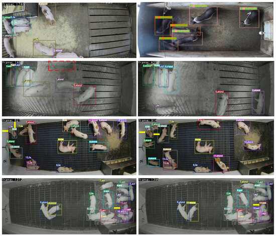 In video surveillance, tracking and behavior recognition are crucial components for group-housed pig monitoring applications. In the field of pig tracking research, various methods have been proposed to achieve an accurate tracking performance. For instance, Chen et al. introduced a real-time detection and tracking method based on YOLACT, successfully detecting and tracking the various major body parts of pigs, thereby providing robust support for pig behavior analysis [14]. Aggaluck et al. achieved accurate pig tracking by training a faster region-based convolutional neural network to identify the body and head of pigs [15]. Gong et al. proposed an improved IOU-Tracker pig tracking algorithm, incorporating the YOLOv5s network for the real-time detection and tracking of pigs [16]. Zhang et al. employed a tracking method based on discriminative correlation filters for the rapid tracking of multiple pigs [17]. Tu et al. proposed an enhanced DeepSORT target-tracking algorithm that integrates the YOLOX-S and YOLOv5s detectors. By focusing on trajectory processing and data association tailored to pig-specific scenarios, they achieved significant improvements in tracking stability [18]. In the realm of pig behavior recognition, researchers have also made significant strides. Zhou et al. introduced a method for individual pig identification using the three-dimensional (3D) point clouds of the pig’s back surface, successfully addressing the challenge of difficult sample collection in pig face recognition [19]. Hao et al. proposed a novel deep mutual learning enhanced two-stream pig behavior recognition approach. Their model integrates two mutual learning networks utilizing RGB and optical flow streams, with each branch comprising collaboratively learning student networks to capture a robust appearance and motion features. This innovative method effectively improves the performance of pig behavior recognition [20]. To investigate aggressive behaviors in group-housed pigs, Gao et al. presented a hybrid model that combines convolutional neural network (CNN) and gated recurrent unit (GRU) to distinguish between aggressive behaviors and other behaviors in monitored videos [21]. Ji et al. proposed a method that employs the temporal shift module (TSM) for the automatic recognition of pig aggression. This approach enhances the accuracy of identifying aggressive behaviors in pigs by allowing the model to effectively process both spatial and temporal features [22]. These research methods have allowed significant progress in pig health monitoring. However, there are still considerable limitations when dealing with complex behavior analysis in pigs, especially in specific scenarios. For instance, collisions between pigs can easily result in target loss, making it challenging to effectively track pig targets for long periods. In commercial automated farming settings, variations in lighting conditions and dense occlusion can lead to frequent changes in target IDs during the tracking process.