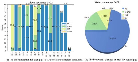 Our proposed behavior analysis algorithm can record the duration of four types of behaviors for each pig and each pen based on behaviors classification and ID information to represent the pigs’ health status and welfare. For example, the analysis results of pig behaviors on test video 0402# are shown in Figure 11 and Figure 12.