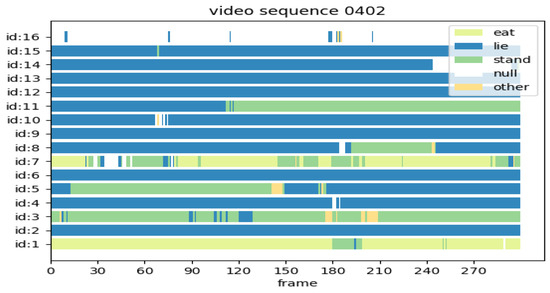 In Figure 11a, the time allocation of each pig’s ID for four behaviors (lie, stand, eat, and other) is depicted. It can be observed that pigs with a different ID value exhibit variations in time allocation for each behavior, with “lie” and “stand” behaviors occupying a larger portion of the time, while “eat” and “other” behaviors are less prominent. Figure 11b illustrates the percentage of four behaviors of all pigs throughout the entire video segment, with different colors indicating each behavior. It is noticeable that the “lie”, “stand”, and “eat” behaviors occurred 72.13%, 16.81%, and 10.33% of the time for all pigs, and the ‘other’ behavior occurred the least at 0.72%. This indicates that the entire herd is in a healthy state. Figure 12 depicts the number of frames occupied by each pig ID, where the horizontal coordinate is the number of frames and the vertical coordinate is the pig’s ID value. It is worth noting that the behavior of some pigs varies frequently, such as those pigs with the IDs with 3, 5, 7, and there are also cases where several pigs engage in a single behavior for a long time. For example, pigs with the IDs 2, 6, 9, 12, 13, and 15 are consistently engaged in “lie” behavior.