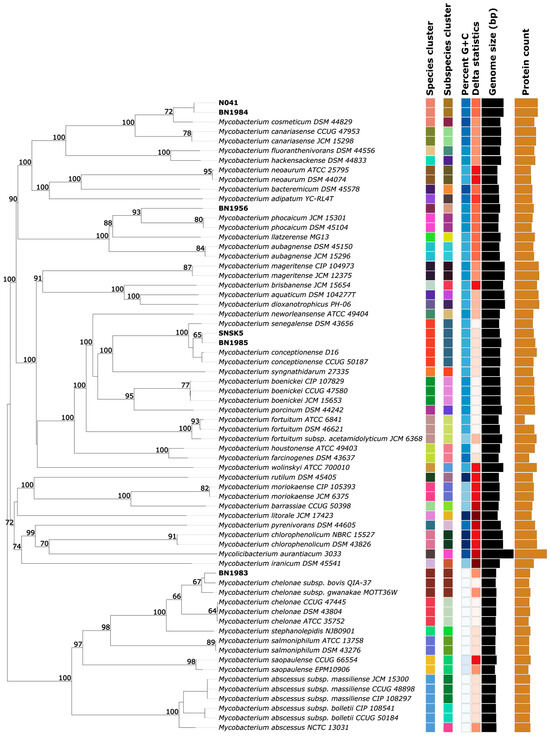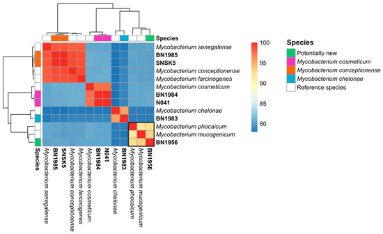 A comparison of species identification results based on the previous 16S rRNA sequence-based homology [11] and the current analysis using the assembled whole genome is summarized in Table 3. Initially, the following six isolates belonging to five different species were identified by DNA barcoding using the 16S rRNA amplicon sequence: Mycobacterium chelonae (BN1983), M. cosmeticum (BN1984 and N041), M. farcinogenes (SNSK5), M. senegalense (BN1985), and M. mucogenicum (BN1956). WGS and extended genomic comparisons with MLST, ANI, and dDDH led to the reclassification of these isolates (see Table 3). Isolates BN1985 and SNSK5 were identified as M. conceptionense, while BN1983 was confirmed as M. chelonae and BN1984 and N041 were confirmed as M. cosmeticum. There were discrepancies in species identification for some isolates when comparing the 16S rRNA sequences with the assembled draft genomes, particularly for isolates BN1985 and SNSK5. Analysis of isolate BN1956 revealed a previously unrecognized species that is proposed here as M. mucogenicum subsp. phocaicum sp. nov. The MLST analysis not only confirmed the identity of these isolates but also revealed similarities in the allele frequencies of housekeeping genes, particularly between isolates BN1984 and N041 and between isolates BN1985 and SNSK5. The similarity of the isolates was further supported by ANI (Figure 1) and dDDH scores (Supplementary Material Table S1). The MLST analysis also suggested that isolate BN1956 might represent a potential new species, as it had an ANI score < 95% compared to its closest relatives, implying that it is not the same species (Table 4).