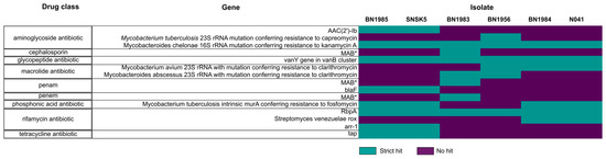 Distribution of antimicrobial resistance genes among the 6 Mycobacterium isolates in this study. Genes with an asterisk (*) appear more than once because they belong to more than one drug class in the Antibiotic Resistance Ontology (ARO). Strict hit represents genes with a bitscore ≥500 when matched to the reference database.