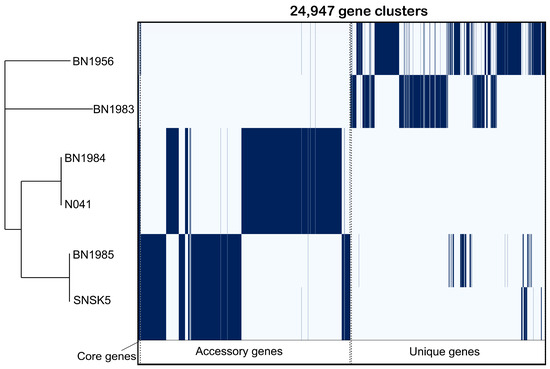 Pangenome analysis of the six isolates from this study was conducted using Roary version 3.13.0 [50] to determine the gene clusters and delineate the core and accessory genomes across the isolates. The analysis was executed using the command “roary -f roary_out -e -n -v -p 30 *.gff”, which enabled parallel processing, excluded splitting paralogs, and allowed for refined gene clustering. This approach facilitated the identification of shared and unique genetic elements among the isolates, providing insights into their genomic diversity and potential functional differences. Following the pangenome analysis, phylogenetic inference for both core and accessory genes was conducted using the maximum likelihood method implemented in IQ-TREE version 2.2.0 [51]. IQ-TREE analysis was performed with the command “iqtree2 -s core_gene_alignment.aln -m MFP -bb 1000 -alrt 1000 -nt 30”. This command employed the ModelFinder Plus algorithm for best-fit model selection, ensuring the most appropriate evolutionary model was used for the data. Additionally, 1000 ultrafast bootstrap replicates and SH-aLRT tests were conducted to assess branch support, providing robust statistical validation for the resulting phylogenetic trees.