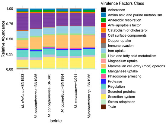 Illustration of the distribution of virulence factor classes among the six Mycobacterium isolates analyzed in this study. Each bar represents the relative abundance of the virulence factors and gives insight into the different virulence profiles of the isolates.