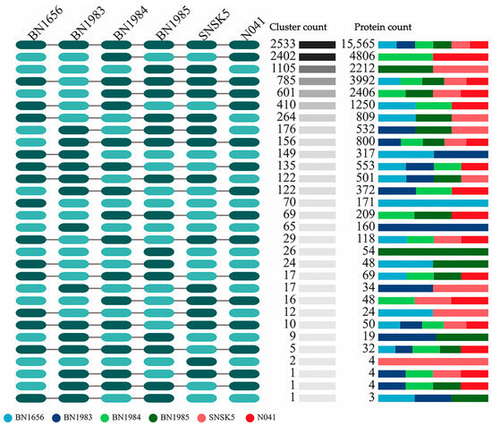 A comprehensive analysis of gene family clusters in six Mycobacterium isolates identified a total of 9334 clusters, of which 2533 occur together and 3215 occur individually (Figure 6). This analysis revealed different patterns in the number of unique gene clusters in the different species. Isolate BN1985, representing M. conceptionense, had 26 unique gene clusters, while another M. conceptionense isolate, SNSK5, had only 2 unique clusters. In contrast, M. chelonae isolate BN1983 had a significantly higher number of 65 unique gene clusters. Remarkably, M. cosmeticum isolates BN1984 and N041 had no unique gene clusters, indicating a greater similarity in gene content compared to other studied Mycobacterium species. The most significant discovery was a potential new Mycobacterium species represented by isolate BN1956, which had the highest number of unique gene clusters, at 70. These variations in the profiles of unique gene clusters illustrate the great genetic diversity within the Mycobacterium genus and provide insights into its evolutionary pathways and potential functional specializations.