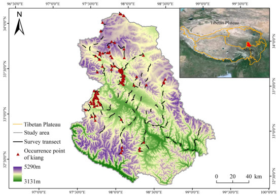 Peripheral populations are wildlife that inhabit the margins of a species’ distribution range and are often characterized by reduced genetic diversity or heightened environmental adaptability [1]. Peripheral populations of a species may hold particular value for the conservation of intraspecific biodiversity. However, due to their isolation and marginal nature, these populations often undergo inbreeding, leading to gene loss and genetic drift, which make them more vulnerable to the risk of extinction [2]. Additionally, the adaptation of peripheral populations to their specific habitats contributes to the preservation of population biodiversity and the expansion of their distribution range [3]. Peripheral populations experience greater pressures from ecological environmental changes, human activities, and climate change than core populations. Shiqu County, Sichuan Province, lies at the eastern edge of the distribution range of the kiang (Equus kiang) on the Tibetan Plateau. To protect and maintain the biodiversity of these peripheral populations, it is imperative to understand the current status of the kiang population and their habitats in this region.