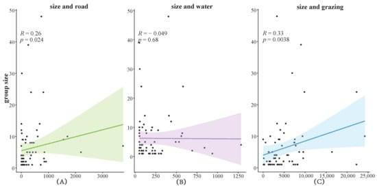 During the transect surveys, a total of 106 kiang groups comprising 503 individuals were observed. The largest observed group contained 48 individuals, while the smallest consisted of a single individual. The group sizes of the kiangs exhibited a significant positive correlation with the distance from roads (p = 0.024) (Figure 2A) and the distance from grazing points (p = 0.0038) (Figure 2C).