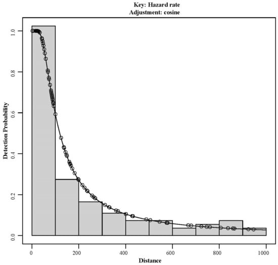 - Buckland, S.T.; Anderson, D.R.; Burnham, K.P.; Laake, J.L.; Borchers, D.L.; Thomas, L. (Eds.) Advanced Distance Sampling: Estimating Abundance of Biological Populations; OUP Oxford: Oxford, UK, 2004. [Google Scholar]