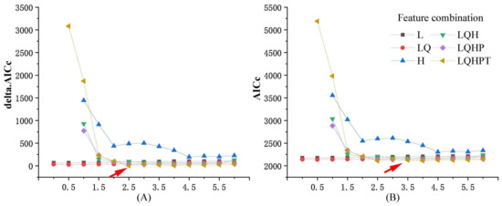 Performance of different parameter settings in the MaxEnt model for predicting kiang habitat suitability. (A) shows the different Feature combinations corrected delta.AICc; (B) shows the different Feature combinations corrected AICc. (The red arrow indicates the optimized model parameters with the lowest AIC value.)