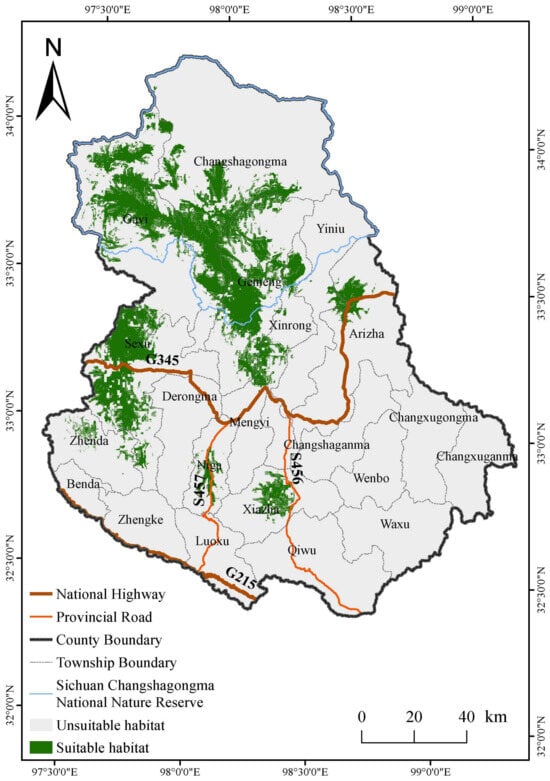The suitable habitat area for kiangs in the study area spans 3402.45 km2, constituting 13.51% of the Shiqu county’s total area. Spatially, the suitable habitat for kiangs is predominantly concentrated in and around six townships, covering approximately Changshagongma, Gayi, Gemeng, Sexu, Xiazha, and Arizha Town. The distribution is patchy, with larger contiguous patches of suitable habitat located around the Sichuan Changshagongma National Nature Reserve and the area surrounding Sexu Town (Figure 5).