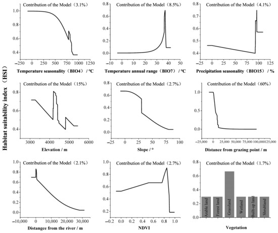 Response curves of kiang habitat suitability to dominant environmental factors.