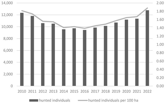 Roe deer (Capreolus capreolus) hunting bag for the Vysočina Region (Czech Republic) between 2010 and 2022 [17].