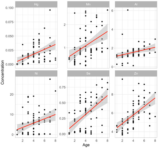 Dependence of Hg, Mn, Al, Ni, Se, and Zn concentration (mg/kg−1) on roe deer age.