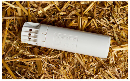 Rumen temperature and activity were monitored using a bolus-type rumen environmental monitoring sensor (Figure 1; Bolus pH plus, SMAXTEC animal care GmbH, Graz, Austria) inserted into the rumen of 75 randomly selected cows from the milking population. The sensor provided measurements for rumen temperature and activity at 10 min intervals. The Bolus sensor consists of a pH, temperature, and a gyro sensor. Rumen temperature was directly obtained from the temperature sensor. At the same time, activity was calculated based on phase changes in an animal’s movement derived from gyro sensor data using the company’s proprietary methods [12]. The pH data were unusable because of the breakdown of most sensors within one month in this study.