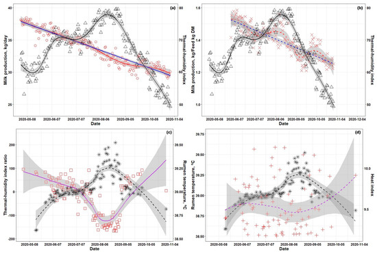 Relationships among the temperature–humidity index (THI), milk production (MP), milk production per feed intake (MPFI), THI ratio, rumen temperature (RT), and heat index (HIduring the experimental periods. (a), THI and MP changes from May to October; (b), THI and MPFI changes from May to October; (c), THI ratio and RT changes from May to October; (d), RT and HI changes from May to October. ○, MP; △, THI; ×, MPFI; *, RT; □, THI ratio; +, heat index. Red line, the MP trend line was analyzed using generalized additive models; blue line and blue dotted line, the MP trend line was analyzed using linear regression; red dotted line, the MP per feed intake trend line was analyzed using locally estimated scatterplot smoothing (loess); black line and black dotted line, the THI and RT trend line was analyzed using the loess method. Purple line and purple dotted line, the THR ratio and the heat index trend line were analyzed using the loess method. The THI ratio was calculated as follows: THI ratio = 1 × Daily percentage under THI 72 − 1 × Daily percentage under THI 72 to 78 − 2 × Daily percentage under THI 78 to 89. The slope weights for the THI ratio calculation were set arbitrarily regarding the correlation with milk production.