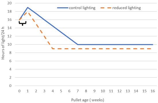 The study was a 2 × 3 factorial arrangement consisting of two lighting regimens and three feeding programs during rearing. A total of 30 day-old pullets allocated to each floor pen were weighed as a group at placement. During week 3, each pullet was identified using a uniquely numbered wing tag. Then, each pullet was individually weighed each week from 4 until 16 WOA. Bird uniformity within each floor pen was also calculated. The two ends of the shed were separated by a transverse lightproof curtain, allowing for two different, individually controlled lighting regimens to be run in each end of the shed. There were 15 floor pens in each end of the shed and for each lighting regimen. The control lighting (CL) regimen was generated by Hy-line® (Hy-Line International, West Des Moines, IA, USA) based on the global location of the shed and scheduled to achieve 10 h light/24 h when birds were 7 WOA. The other end of the shed followed a reduced lighting (RL) regimen similar to the rapid lighting program of Hester et al. [23] and achieved 9 h light/24 h when birds were 4 WOA. The lighting regimens during rearing are presented graphically in Figure 1 and were as follows: CL regimen consisted of intermittent lighting of 4 h light:2 h dark/24 h from 0–1 WOA, 19 h light/24 h from 1–2 WOA, 17.5 h light/24 h from 2–3 WOA, 16 h light/24 h during 3–4 WOA, 14.5 h light/24 h during 4–5 WOA, 13 h light/24 h during 5–6 WOA, 11.5 h light/24 h during 6–7 WOA, and 10 h light/24 h from 7–16 WOA. In contrast, the RL regimen followed intermittent lighting of 4 h light: 2 h dark/24 h from 0–1 WOA, 18 h light/24 h from 1–2 WOA, 15 h light/24 h from 2–3 WOA, 12 h light/24 h from 3–4 WOA, and 9 h light/24 h from 4 to 16 WOA. Light intensity (lux) followed breed recommendation for age [1]. It ranged from 45–50 lux during the first week of rearing, then 20–25 lux until pullets were 4 WOA, when it was reduced to 5–10 lux. At 15 WOA, the light intensity was increased to 20–25 lux in preparation for pullet transfer to the layer facility. From placement until 4 WOA, all birds were fed ad libitum, and total FI for each floor pen of pullets was recorded. From 4 until 16 WOA, three feeding programs were allocated to 5 pens within each lighting regimen. To minimize bias, each group of 3 consecutive floor pens within each lighting regimen were set as a block, and the three feeding programs were allocated at random across the 3 consecutive floor pens. The feeding programs were as follows: 1, ad libitum feeding (identified as ad lib feeding); 2, Feeding-determined quantities of feed each day to achieve the breed standard weight (BSW) for age (identified as BSW feeding); and 3, feeding-determined quantities of feed each day to achieve 88% of the BSW for age (identified as managed feeding). Within each pen, 15 cm feed space was provided for each pullet, which exceeded the breed standard recommendation of 8 cm/pullet [1]. This ensured all birds were able to readily access the feed at the same time. Between 5 and 16 WOA, the uniformity of pullets within each floor pen ranged from 93.8 to 94.8%, which also exceeded the breed recommended uniformity of 85% or higher from 6 to 16 WOA [1].