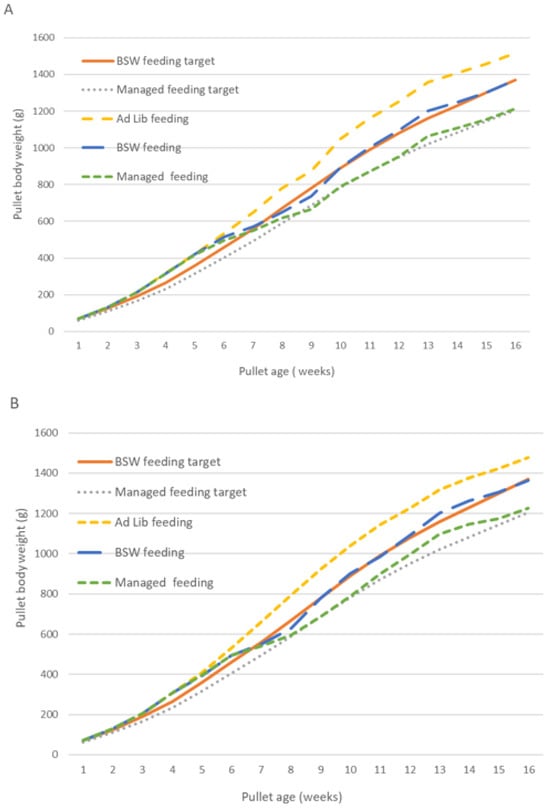 The growth curves illustrated in Figure 2A,B show pullet BW following a similar upward trajectory after the initial adjustment to the amount of feed offered in each of the three feeding programs that were introduced when the pullets were 4 WOA. Interestingly, during the second, third, and fourth weeks on the developer diet (i.e., 13–16 WOA), the average daily FI of pullets on the ad lib feeding programs was lower than during the first week on the developer diet (12–13 WOA; Table 1). Some of this reduction in FI is most likely due to the pullets adapting to the developer diet, which was in mash form compared to the crumble form of the Barastoc® starter and grower diets. Concurrently, the amount of feed provided to the BSW and managed feeding programs under both lighting regimens was less during the final three weeks on the developer diet, as their BW had moved above the target weight at the start of week 13 (Figure 2A,B). Critically, despite lower FI in all feeding programs, pullet BW continued to increase over this time.