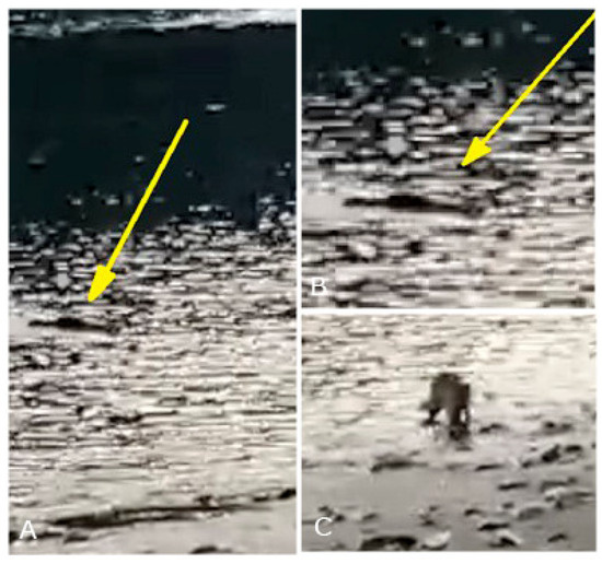 Figure 2. Sequence of still frames (screenshots from the video) showing the güiña swimming and emerging from the water. (A). Güiña swimming; (B). a close-up of photo A; (C). güiña emerging from the water. The video is available in the Supplementary Material (Video S1).