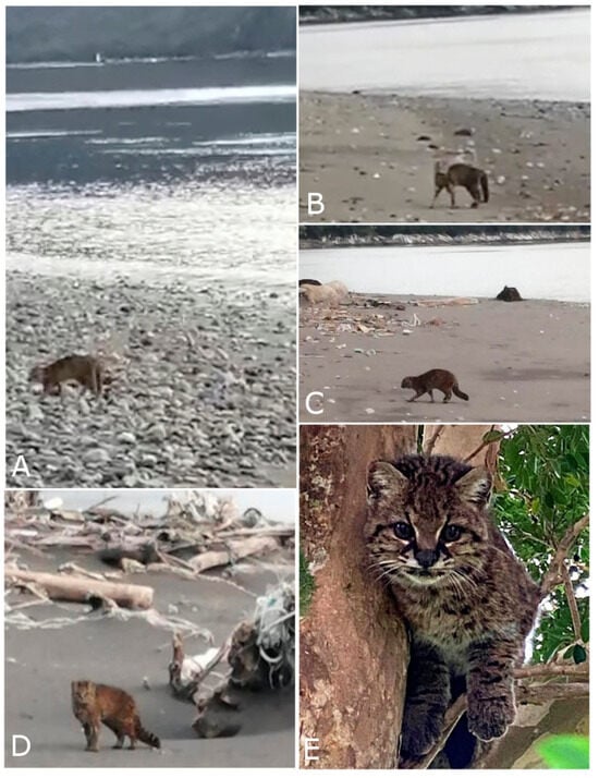 This is the first documented case of a güiña in a marine environment. The observed güiña exhibited a mottled phenotype and appeared to be in good health, although its sex and age remain undetermined. The individual was observed swimming in the Refugio Channel (Figure 1) and then emerging on the eastern coast (Figure 2). This happened in the middle of the day from 2.00 pm to 3:00 pm during a casual and unscheduled observation. After exiting the water, the güiña shook itself, crossed a strip of beach of about 35 m from the tide line to the coastal forest (Figure 3A–D), and climbed a tree where it groomed itself (Figure 3E). The possibility of having accidentally fallen into the water was rejected given the gently sloping conditions in a large sector of the coastline surrounding the observation.