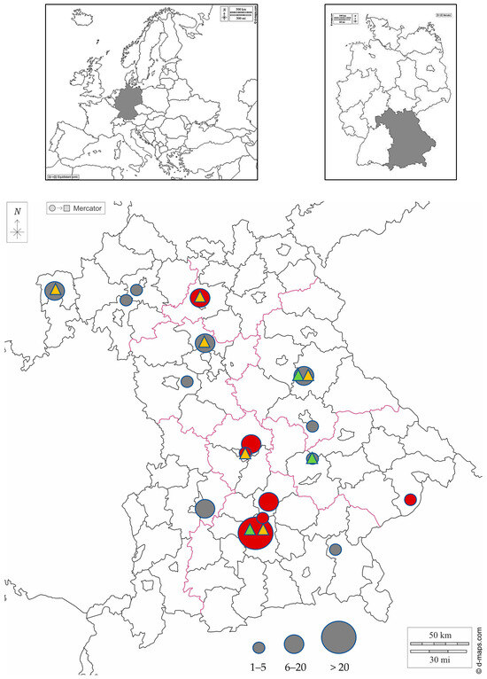 Rural administrative district map of Bavaria showing the collection areas of wild rabbits. Numbers of sampled rabbits per administrative district are semiquantitatively indicated by differing circle diameters. Areas in which wild rabbits were tested seropositive for E. cuniculi are marked in red, while areas in which all tested wild rabbits were seronegative are marked in dark gray. Areas in which E. cuniculi DNA has been detected in wild rabbits using molecular testing methods are highlighted with a yellow triangle. Areas in which E. hellem DNA has been detected using molecular testing methods are highlighted with a light green triangle. Maps were taken from d-maps.com (https://d-maps.com/carte.php?num_car=6121&lang=de, https://d-maps.com/carte.php?num_car=17879&lang=de, https://d-maps.com/carte.php?num_car=2233&lang=de; accessed on 1 August 2024).