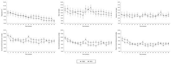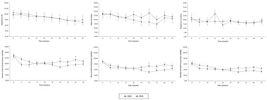 Physiological parameters, including temperature (TEMP), heart rate (HR), respiratory rate (RR), systolic, mean, and diastolic arterial blood pressure (SAP, MAP, and DAP, respectively), are presented as mean values ± standard error of the mean (SEM) for the TKD and TKX groups within short-term anesthesia (45-min). (compared between group: * p < 0.05).