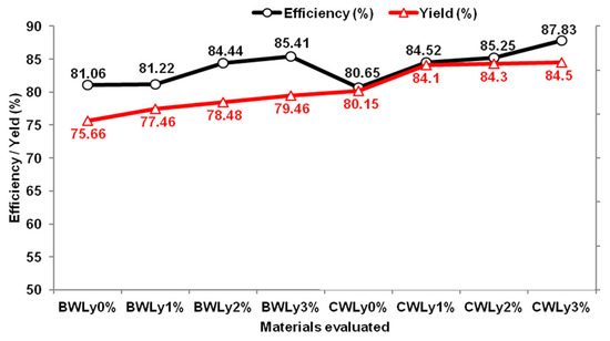 The results obtained for the microencapsulation yield of Lys with BW (BWLys) or CW (CWLys) associated with tannin as a wall material indicate that the emulsification and oven-drying technique was adequate, with no significant losses during the processing of the materials, showing microencapsulation yields of over 80% in all concentrations.