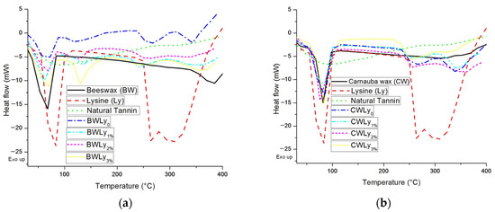 Differential exploratory calorimetry showed that thermal events below 100 °C corresponded to the loss of moisture in each material. BW showed an endothermic event (event 1) at 68 °C, related to its melting, and another endothermic event (event 2) at 385 °C, related to its thermal degradation (Figure 2a), while Lys showed three endothermic events at 83, 264 and 309 °C, and tannin showed an endothermic event at 99 °C.
