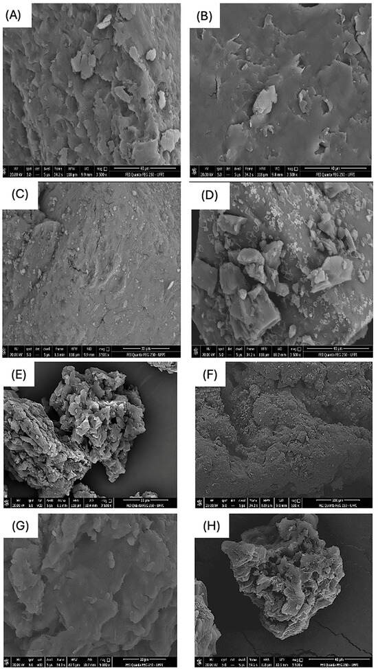 Figure 4E, in which the carnauba wax is encapsulating the Lys, shows particles with a highly textured surface with irregular shape, indicative of a porous structure, so it may indicate that the particles have a large surface area, which could be useful in applications such as catalysis or adsorption. Figure 4F, in which beeswax encapsulates Lys, shows a highly magnified texture that resembles a rough, uneven surface with several clusters of materials. Figure 4G (BW + Lys + tannin) shows a highly magnified texture of the surface of this material composed of an irregular surface with agglomerates of various sizes that create a rough texture. The CW + Lys + tannin (Figure 4H), on the other hand, shows the highly enlarged texture of a rough and scaly sample with several layers and protuberances.