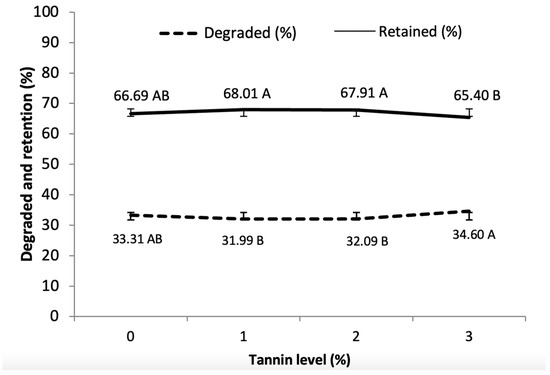 Degradation and retention of dry matter (DM) of encapsulates as a function of the level of tannin, regardless of the type of wax and incubation time in the DaisyII ANKOM. Different letters indicate significant differences at p < 0.05; same letters indicated no significant differences (p > 0.05).
