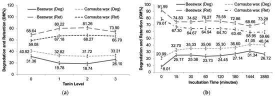 Degradation and retention of dry matter (DM) of lysin bypass encapsulated products as a function of tannin levels (a), and in situ incubation time (b).