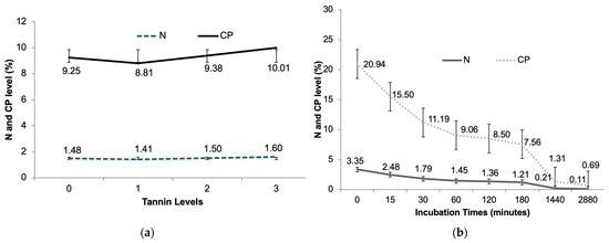 Average nitrogen (N) and crude protein (CP) of lysin bypass encapsulated products as a function of tannin level (a) and in situ incubation time (b).
