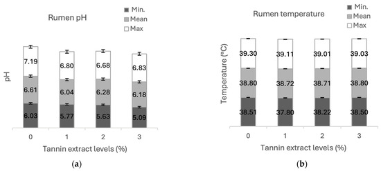Rumen pH (Figure 8a) and temperature (Figure 8b) were similar for the animals fed regardless of the wax (BW vs CW) used and the level of tannin (p < 0.05). For the two waxes with 0% tannin, the maximum temperature was 39.3 °C and the minimum was 38.5 °C at the start of incubation (0 min). With 3% tannin, the maximum temperature was 39 °C and the minimum was 38.5 °C at the last incubation time (2880 min) for both waxes. For BW and CW without the inclusion (0%) of tannin, the maximum pH value was 7.19 and the minimum was 6.03. Both waxes with the addition of 3%TJP showed values of 6.83 (max) and 5.09 (min). The rumen pH remained constant throughout the incubation periods.