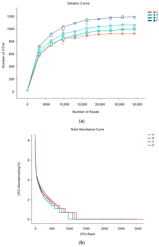 (a) Dilution curve of microbes in pigeon milk; (b) rank abundance curve of microbes in pigeon milk. Group A drank normal water; Group B was supplemented with 3 × 106 CFU/mL E. faecium; Group C was supplemented with 2 × 107 CFU/mL B. subtilis; Group D was supplemented with 3 × 106 CFU/mL E. faecium and 2 × 107 CFU/mL B. subtilis.