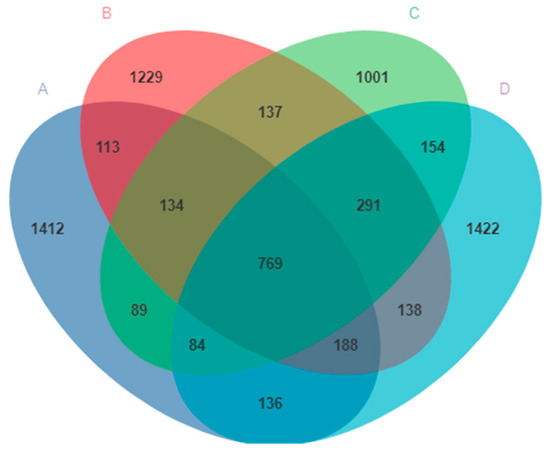 The V3–V4 region of the 16S rDNA genes was sequenced from the pigeon milk collected from all four groups. A total of 1,670,381 sequences were obtained. After sequencing, errors were removed and chimeric filtering performed, so that 999,936 sequences remained. A total of 8140 OTUs were then obtained and annotated at the domain level, according to 99% sequence similarity. The exact numbers of OTUs obtained were 1412, 1229, 1001, and 1422 for Group A, Group B, Group C, and Group D, respectively (Figure 2). There were 769 OTUs common to all four groups, and the number of OTUs in group D was higher than that in any other groups (Figure 2).