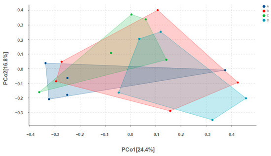 Alpha diversity results are shown in Table 4. No significant differences among groups were found for any of the indices. Values for Chao1 richness, observed species, Pielou’s evenness, the Shannon diversity index, and Simpson’s index for Group D were all higher than the corresponding values for Group A, but none of these differences were statistically significant (p > 0.05). Beta diversity results are shown in Figure 3.