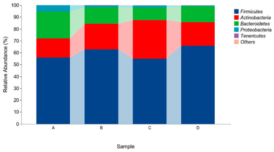 Relative abundances of species based on phylum classification level. Group A drank normal water; Group B was supplemented with 3 × 106 CFU/mL E. faecium; Group C was supplemented with 2 × 107 CFU/mL B. subtilis; Group D was supplemented with 3 × 106 CFU/mL E. faecium and 2 × 107 CFU/mL B. subtilis.