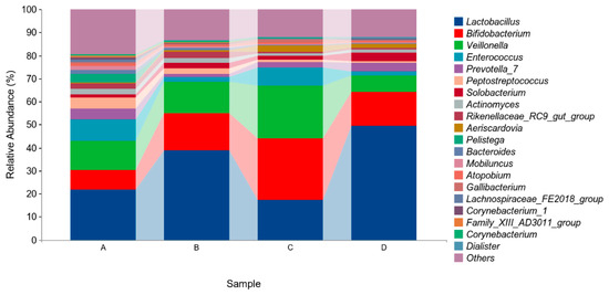 Relative abundances of species based on genus classification level. Group A drank normal water; Group B was supplemented with 3 × 106 CFU/mL E. faecium; Group C was supplemented with 2 × 107 CFU/mL B. subtilis; Group D was supplemented with 3 × 106 CFU/mL E. faecium and 2 × 107 CFU/mL B. subtilis.