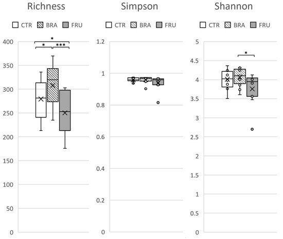 Richness, Simpson, and Shannon indexes for alpha diversity, based on ASVs of dog’s fecal microbiota. CTR—control diet low in TDF (5.7%); BRA—diet enriched with fiber from cereals (12.0% TDF); FRU—diets enriched with fiber from fruits (12.2% TDF). Outliers, the values that are above or below 1.5 times the interquartile range, are represented as circles and the means are represented as X. The central line represents the median. * p < 0.05, *** p < 0.001.